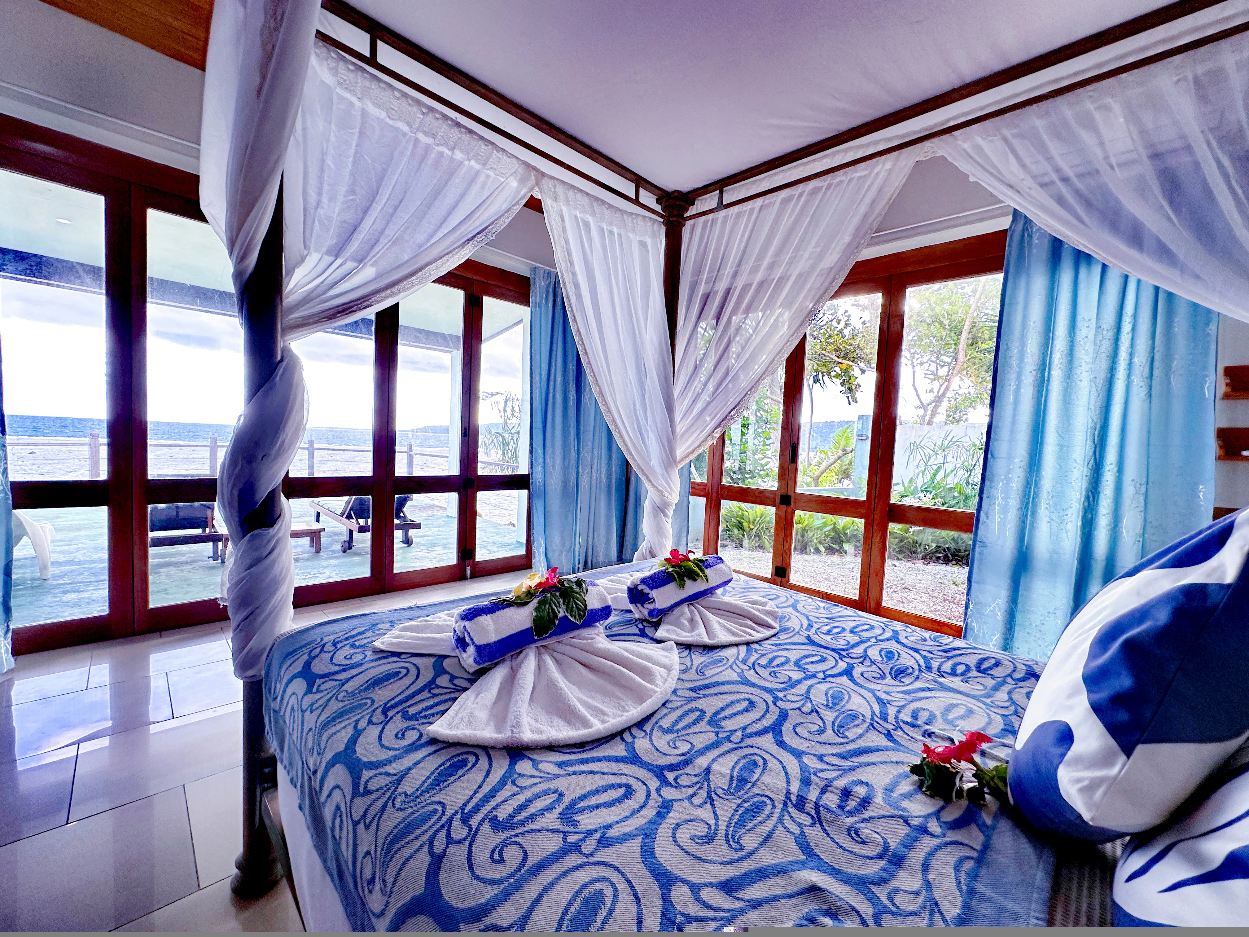 The 2 Bedroom Oceanfront Villa features a wall of glass doors that completely opens to the deck from the living and bedroom areas.